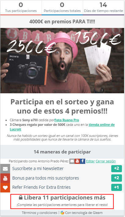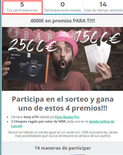 Muy fácil, tan sólo debes entrar en el widget del sorteo y desde ahí podrás empezar a realizar acciones para recibir participaciones. Una vez que hayas cumplido alguna acción, verás en la parte superior izquierda del widget del sorteo el número de participaciones que tienes.