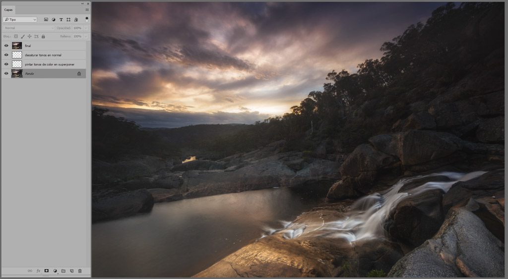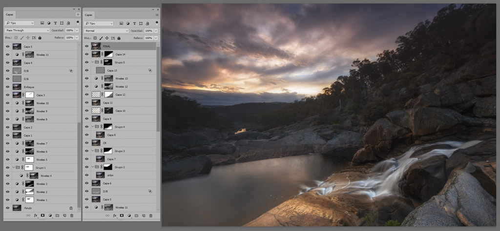| Muuuuuy buenas Antonio! Vaya sitio guapo nos traes no?? Antes de nada comentar que ha sido un acierto adquirir la video guía. Aunque la versión de la paleta sea la 5, la video guía es genial. Bueno a lo que estamo, que nos despistamos…1º como casi siempre en mis revelados hago dos revelados básicos en LR uno para las altas luces y otro para las sombras jugando con diferentes temperaturas del color (Un revelado con alta temperatura para las altas luces y otro con Tª más baja para las sombras) los combino mediante máscaras de luminosidad (luces 2 suele funcionar bien, si no las modifico ligeramente con los niveles y si se queda poco intenso duplico la capa 🙂 ). 2º Ajustes tonales generales: Mediante una capa de curvas y sin enmascarar la capa de ajuste he aumentado ligeramente la dominante amarilla y le he quitado el tono verdosillo para virar ligeramente al magenta. 3º He aplicado diferentes intensidades de claridad para intentar diferenciar diferentes planos en la escena, cómo? aumentado claridad a saco enmascarando y pintando con diferentes intensidades de blanco. 4º Sacar los naranjas y amarillos al cielo con una capa de curvas y aplicando un máscara de luminosidad para el canal rojo, también le he dado un poco más de contraste. 5º Utilizando diferentes seleeciones de las máscaras de bajas luces he ido ajustando niveles, levantando sombras por selecciones con diferentes máscaras de luminosidad. 6º Sombras y luces…¡a pintar! mediante máscaras de luminosidad he ido sacando textura a los granitos (casi se distinguen las biotitas jaja) y fracturas y dando puntos de luz sobre todo en la cascada. 7º Para ir terminando arton selectivo mas en cielo y último plano y casi cero en el primer plano. 8º Make it glow sutil para calentar mas el cielo. 9º Enfoque para web y guardar para web. Y creo que es todo!! Un saludo y nos vemos la semana que viene!!! |