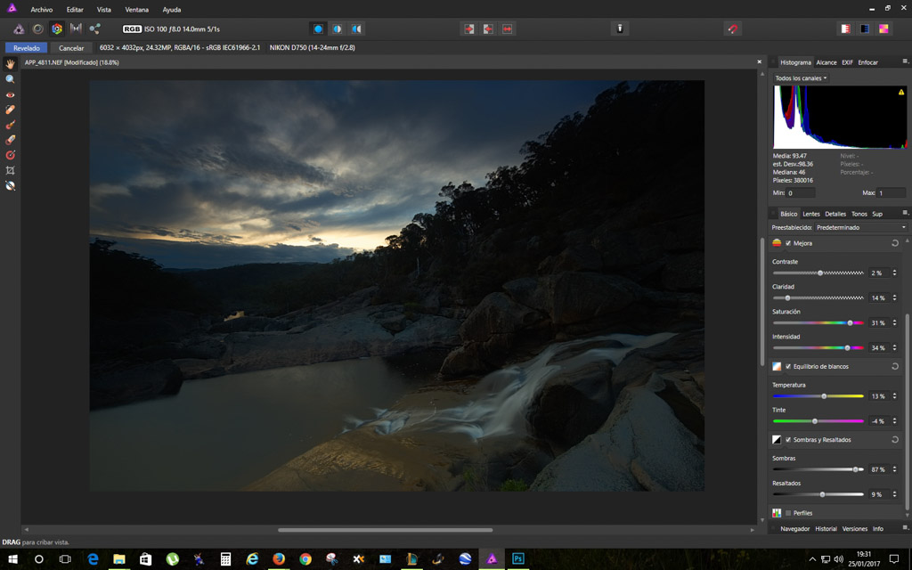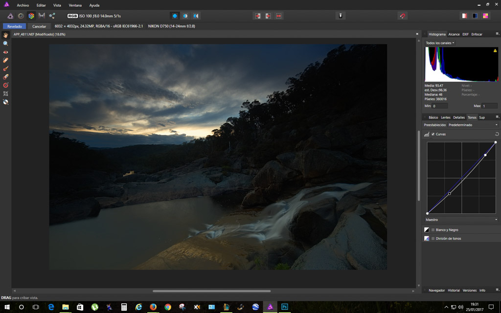 | Muy buenas Antonio, y como ese es mi primer aporte, antes que nada agradecerte el gran trabajo que realizas tanto en tu pagina como en el canal de youtube, hoy en dia es dificil encontrar a alguien que des interesadamente comparta sus conocimientos, ya se, ya se,…que esta la videoguia, yo la descargue cuando no tenia descuento, que por cierto es una pasada, y ahora estoy esperando que saques la nueva, en algo hay que colaborar. Dicho esto vamos a por mi primer procesado, he empezado levantando la luz de la imagen intentando no pasarme y reventar las altas luces tambien he decidido bajar la claridad ya que intentaba dar un aire de amanecer brumoso, después un filtro graduado bajando la exposición para no perder el cielo, uno radial con un poco de neblina y claridad para potenciar el sol, y con un pincel he intentado emular unos rayos de sol que se filtran en la parte trasera, no e si lo habré logrado. Para darle un poco mas de presencia a la parte frontal de las piedras y la cascada otro pincel aumentando claridad, enfoque y exposición, un par de pinceles mas para u dodge and burn y finalmente he vuelto a subir la exposición de toda la imagen, Bueno, espero tus consejos, saludos. |