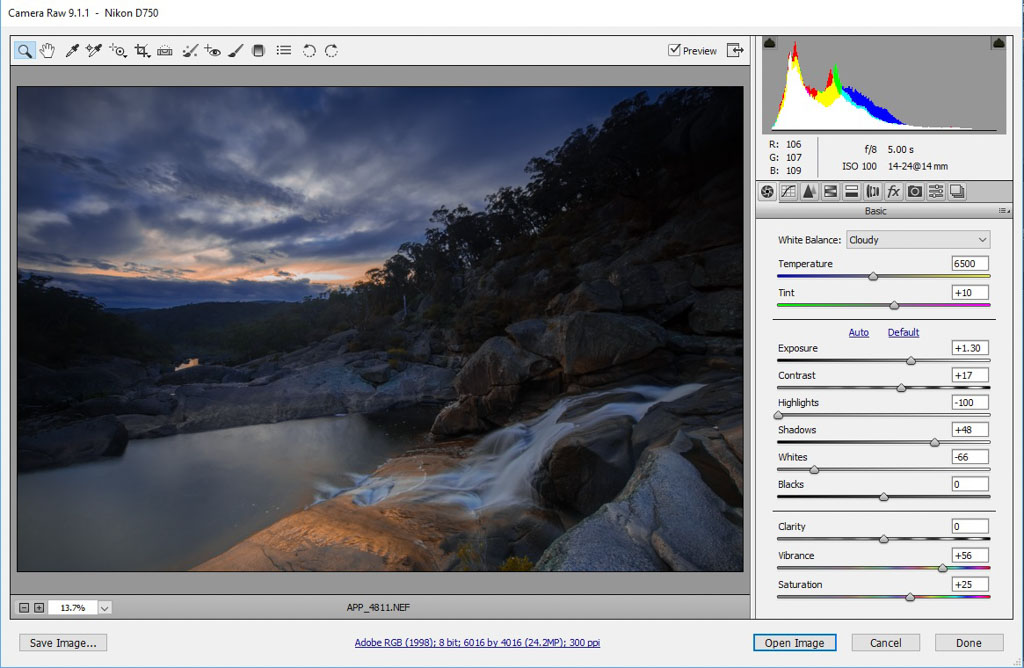 Hola Omar, pues para haber trabajado solo en camera raw no está nada mal. Personalmente veo un cielo un poco “extraño” sobre todo en la zona de las altas luces, creo que has intentado recuperar demasiado esos blancos…y a lo mejor lo que había que hacer era no luchar contra ellos, jejejeje.. Al haber recuperado altas luces, los blancos de la cascada se han quedado..supermuertos…. Aparte, tienes una dominante muy acusada de azules…puede que sea buscada, no lo sé, pero ahí está!!! La zona de las sombras, me encanta como te ha quedado, suave, con texturas, detalles, pero sin pasarse de luz, muy natural. GRACIAS!