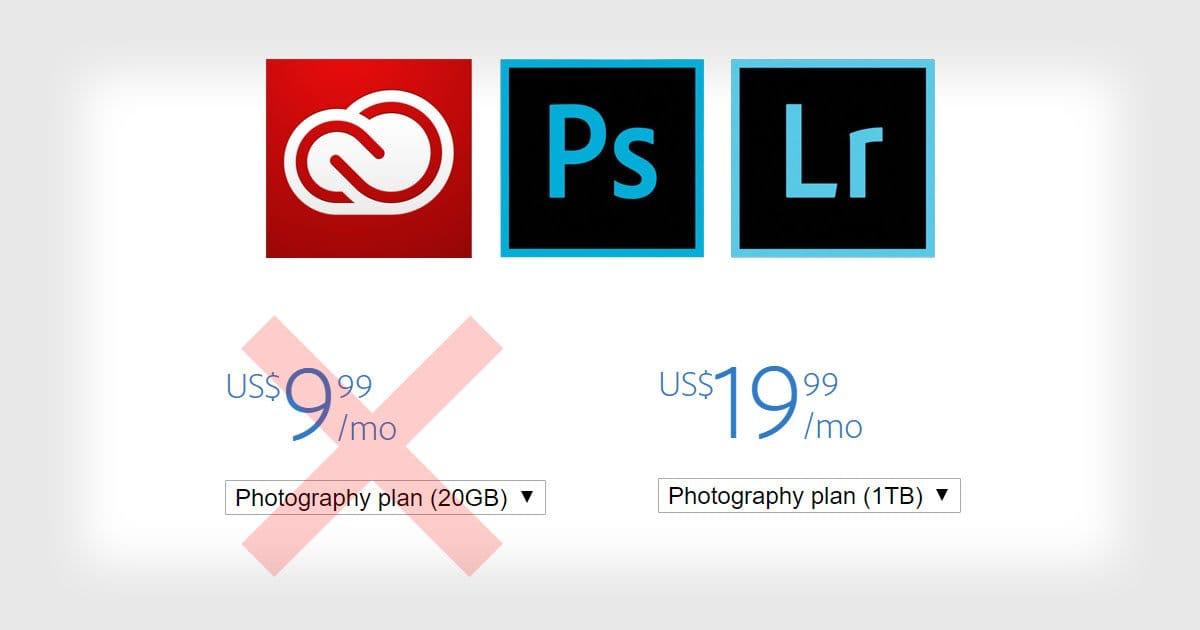 Desde ayer, a muchos usuarios ya no les aparece la opción de Lightroom + Photoshop + 20Gb, y solo aparece la de 1Tb, dejando el precio en 20$ en EEUU que aquí serán 24€ ) manda huevos la conversión que hacen por cierto).