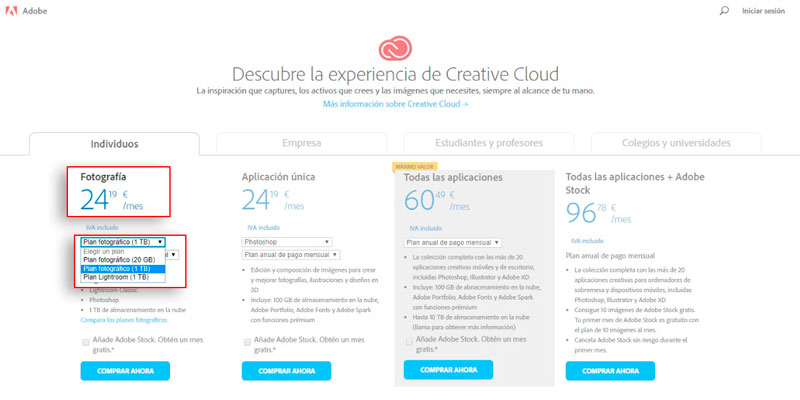 - El plan de 12€ para Lightroom CC con 1 TB de almacenamiento