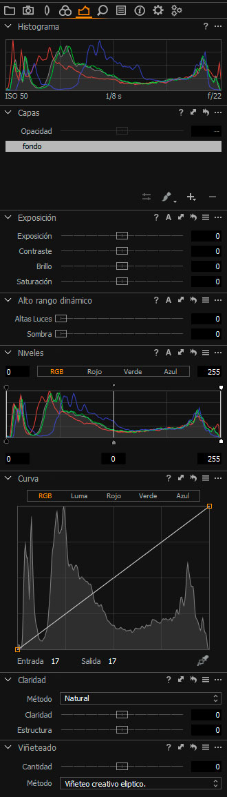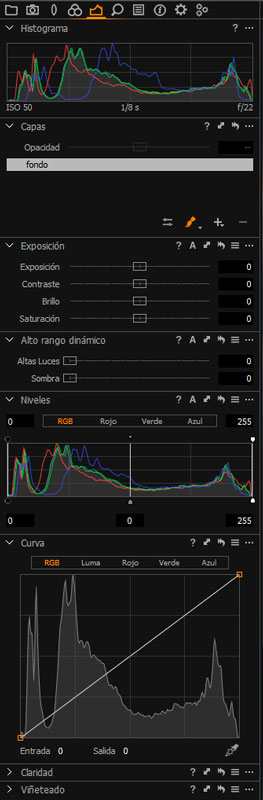 También se incluyen en esta vista predeterminada las herramientas de niveles y curvas, así como la súper potente de claridad con sus múltiples modos de uso.