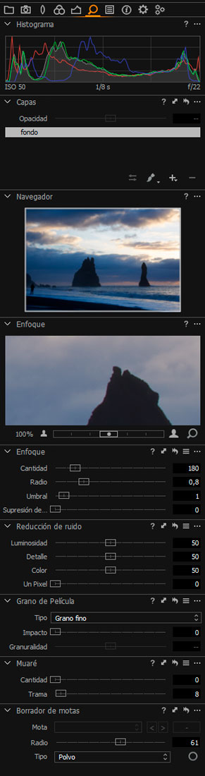 Básicamente una pestaña que nos va a permitir controlar el enfoque, la nitidez y el ruido de nuestros RAWS. Podemos utilizar la herramienta de enfoque para poder visualizar al 100 la imagen y comprobar la nitidez.