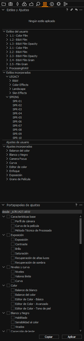 En esta categoría se engloban por defecto dos apartados muy interesantes. En primer lugar, todo lo relacionado con los potentísimos estilos, que son los equivalentes a los presets de Lightroom. Desde aquí podremos aplicar, guardar o crear cualquier estilo.
