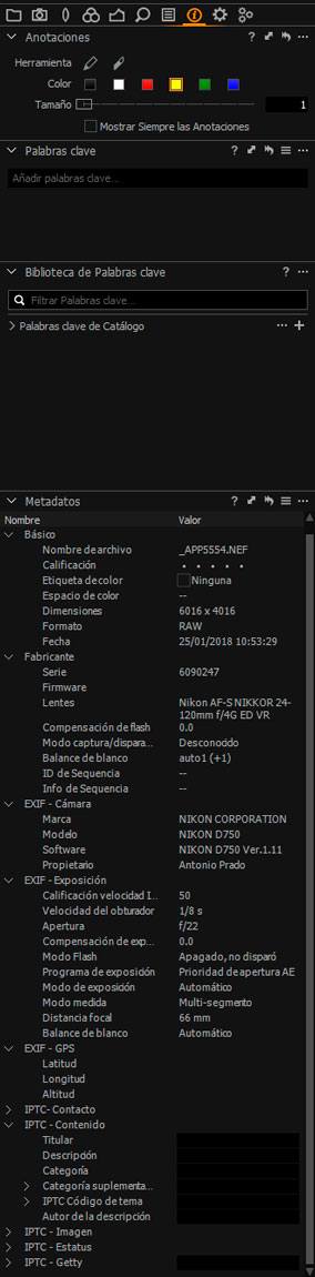 Categoría de herramientas que nos permiten visualizar y editar los metadatos de nuestros Raw. Desde aquí podremos comprobar todos los datos exif que nos interesen y sobre todo crear y añadir nuestra propia información, incluso añadir un preset de Metadatos para insertar en todas nuestras fotografías, con el copyright, información de cliente, etc…