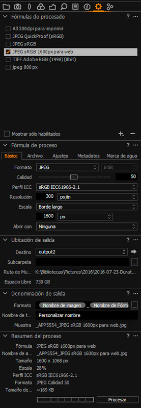 Una de las pestañas más interesantes y que más vas a usar es esta ya que aquí es donde se controla la exportación de nuestras imágenes. Tenemos un sinfín de herramientas para conseguir facilitarnos y agilizar el procesado de los Raw. Ya hablaremos de los Tokens, ¡pero vais a alucinar!!!