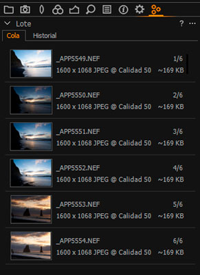 Otra de esas pestañas que al principio tienes la tentación de quitar por ahorrar espacio pero que finalmente utilizas mucho. Es una herramienta que nos va a permitir controlar la cola de trabajo y la historia de exportaciones realizadas. Así podremos reordenar la cola de trabajo por si tenemos prioridad en algún archivo en concreto, o podremos incluso reprocesar fotografías partiendo de la historia de trabajo.