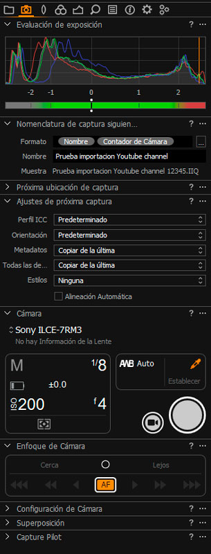 Esta pestaña es la puerta de entrada a todos los ajustes relacionados con el tethering. Desde aquí vamos a poder controlar nuestra cámara y su conexión directa con Capture One: ajustar la exposición, aplicar ajustes o estilos durante la captura, etc…