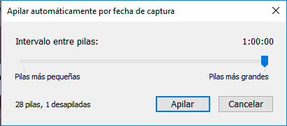 Para el caso del ejemplo, he seleccionado un valor intermedio de 25´este valor dependerá del tipo de fotografías que haya en tu carpeta o colección, no es igual el tiempo que pasa en una sesión de fotos en una comunión o boda, que el que pasas en una sesión de paisaje, así que cada uno debe ir probando el intervalo adecuado para que el apilamiento automático por fecha de captura funcione a la perfección: