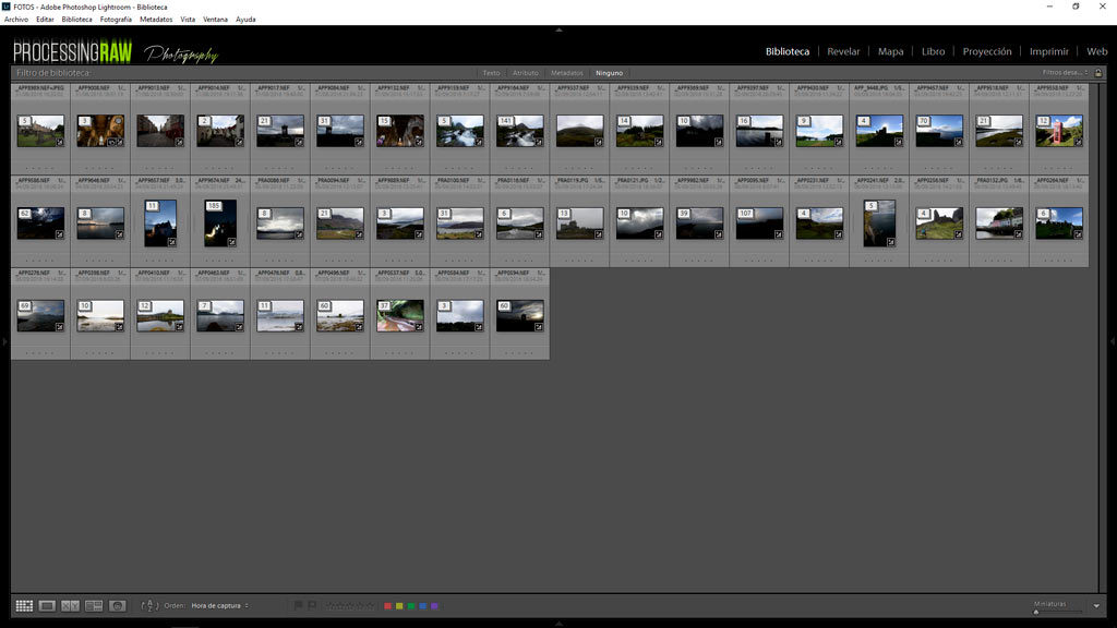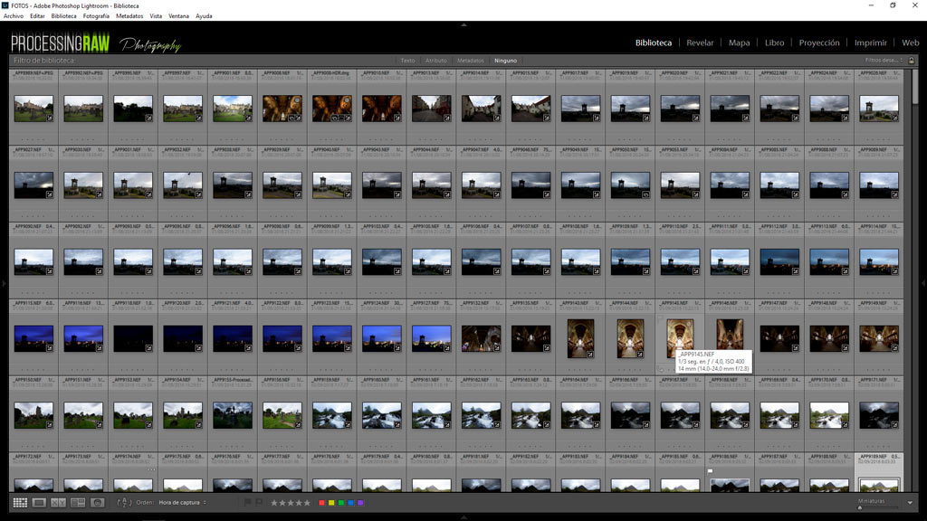 Para este ejemplo vamos a usar una carpeta de fotografías que tengo en mi catálogo de Lightroom en el que tengo 1164 fotografías sueltas, tomadas en diferentes días, diferentes puntos, etc. Tal y como está ahora es una auténtica pesadilla el encontrar cualquier foto, y toca ir scrolleando múltiples veces hasta encontrar la fotografía deseada.