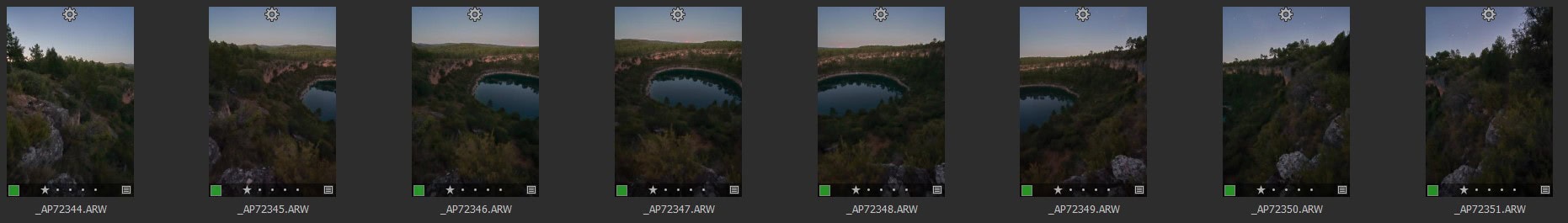 Estas son las imagenes que compondrán la panorámica de la zona del suelo - Realizar panorámicas de la zona del cielo. Tantas panorámicas como necesites para pillar completamente el arco de la Vía Láctea. Aquí es importante que seas conservador y dejes bastante espacio, o te arrepentirás a la hora de montarla. Cuando «cosamos» la panorámica del arco, vamos a deformar los bordes, así que es mejor que «lo que te interesa de la foto», tenga bastante aire.
