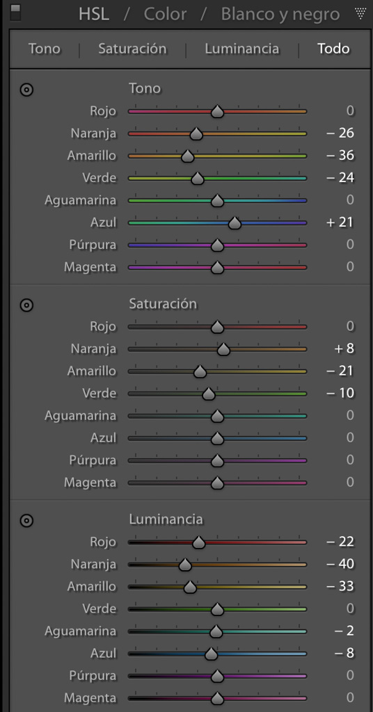 | Esta vez Antonio no se si hay «truco o trato» pero te cuento lo que ido haciendo. De los 6 archivos, con tres de ellos he hecho un HDR y como siempre los primeros pasos empiezo tocando la calibración de cámara para en el primario azul dejar la saturación a +100. Después en corrección de lente, quitar la aberración y activar las correcciones de perfil. En detalle he dejado el foco en 65 y en ruido a 100. En HSL adjunto una captura de pantalla y otra de básicos . También le he aplicado 2 filtros graduados y 1 radial. Los reflejos en las hojas, los he quitado en Photoshop clonandolo. Para finalizar con el pincel he ido tocando por varios sitios para darle un poco mas de luz. Lo que no he sabido es que pretendías con los otros tres archivos que una mano está tapado el sol. Ya nos dirás. Espero tu opinión como siempre y gracias por compartir tu saber, que es de 10. Gracias amigo. |