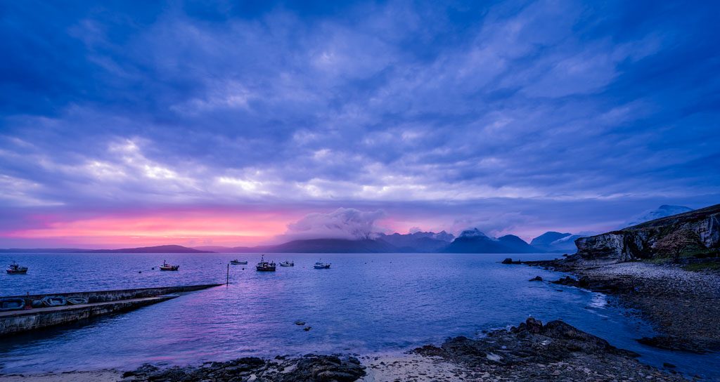 | Todo el procesado ha sido realiza en Lightroom. He empezado con corrección de lentes y seguidamente ajustes de calibración de cámara en modo camera standard, me gusta el resultado que da. Seguidamente empece el revelado. Balance de blancos a mi gusto, partiendo del modo nublado, ajustado un . poco los valores hacia tonos cálidos ya que quería que el resultado final tuviste esos tonos. Ajuste el deslizado de iluminación y sombras hasta conseguir un histograma equilibrado. Bajo un poco la exposición para conseguir un punto menos de luz general. Aplico filtro degradado vertical al cielo dandole un poco menos de exposición y usando borrando niebla y claridad, suavemente, para dar dramatismo al cielo, ya que considero que es una de las partes importantes de la imagen. Aplico unos filtros radiales para dar luz y color a los puntos de luz que se encuentran en el agua, rosas y magenta, Aplico pinceles en modo sombras y luces en zonas concretas de la imagen, muy suavemente. Uso división de tonos para darle un poco de calidez a la imagen, en luces altas le doy un poco de calidez y en sombras le doy un tono mas frío. el deslizado de equilibrio lo tiro hacia el tono salido. Reducción de ruido a un 20% y enfoque a un 45 % mas o menos. La imagen me evoca ese punto de calidez y frío que da el amanecer, la potencia del astro rey se mezcla con ese azul de antes del amanecer. Un gran país Escocia. |