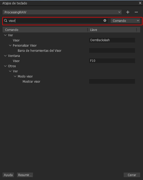 Por ejemplo, me encanta asignar la tecla (<) a mostrar y ocultar el visor, puedo abrir el editor de atajos de teclado, buscar por “visor” y asignarla rápidamente. Del mismo modo, quiero buscar un atajo para añadir una capa vacía que lo hago mucho. Puedo buscar por tecla (,) y ver si hay algo asignado, y si no hay nada se lo asigno a crear nueva máscara vacía. Lo mismo para refinar máscara que lo uso constantemente y la he asignado a la tecla R.