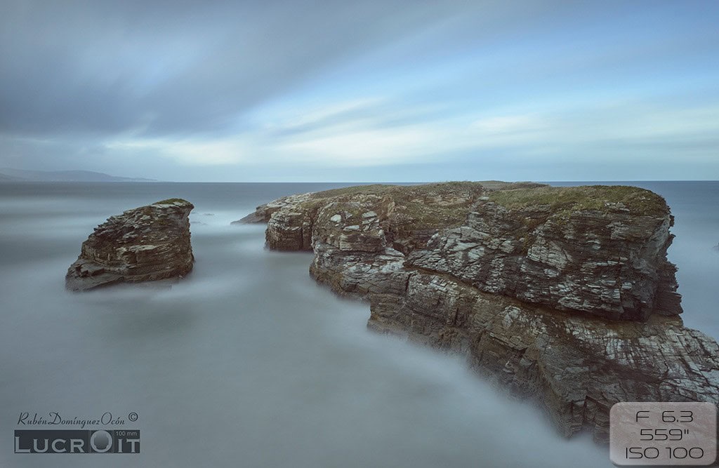 En este caso incluso tras poner el densidad neutra de 10 pasos, no conseguía el tiempo de exposición que necesitaba, (para conseguir un efecto de trazas largas de nubes necesitaba un tiempo de 7-8 minutos mínimo) así que cerré el diafragma 3 pasos: