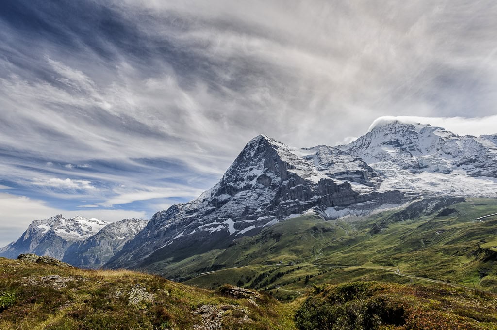 La ruta continua por una pista en buen estado hacia Kleine Scheideg, otra de las famosas estaciones/pueblo del Lauterbrunnen. Durante este trayecto, vamos aproximandonos a las tres grandes moles rocosas que dominan la zona: El Jungfrau (doncella), el Monch (monje) y el Eiger (ogro), todos ellos superando la barrera de los 4000m, pero sin duda es éste último el que más impacta. Su cara sur, es tremendamente agreste, desafiante, da miedo solo pensar en como atreverse a escalarla.