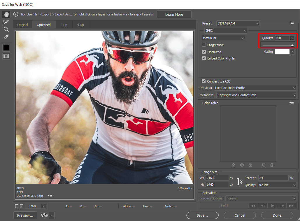 Otro de los parámetros que más guerra y dudas os genera. La calidad a la que debéis exportar vuestras fotografías. Bien, pues vais a ver lo sencillo que es. Tal y como os comentaba en el apartado inicial lo que debéis hacer es tan simple como guardar vuestros archivos a la máxima calidad posible, no penséis en el tamaño del archivo ya que Instagram se encargará de comprimir la imagen por vosotros, así que enviarle un archivo con la mejor calidad posible de partida. 100% y punto.