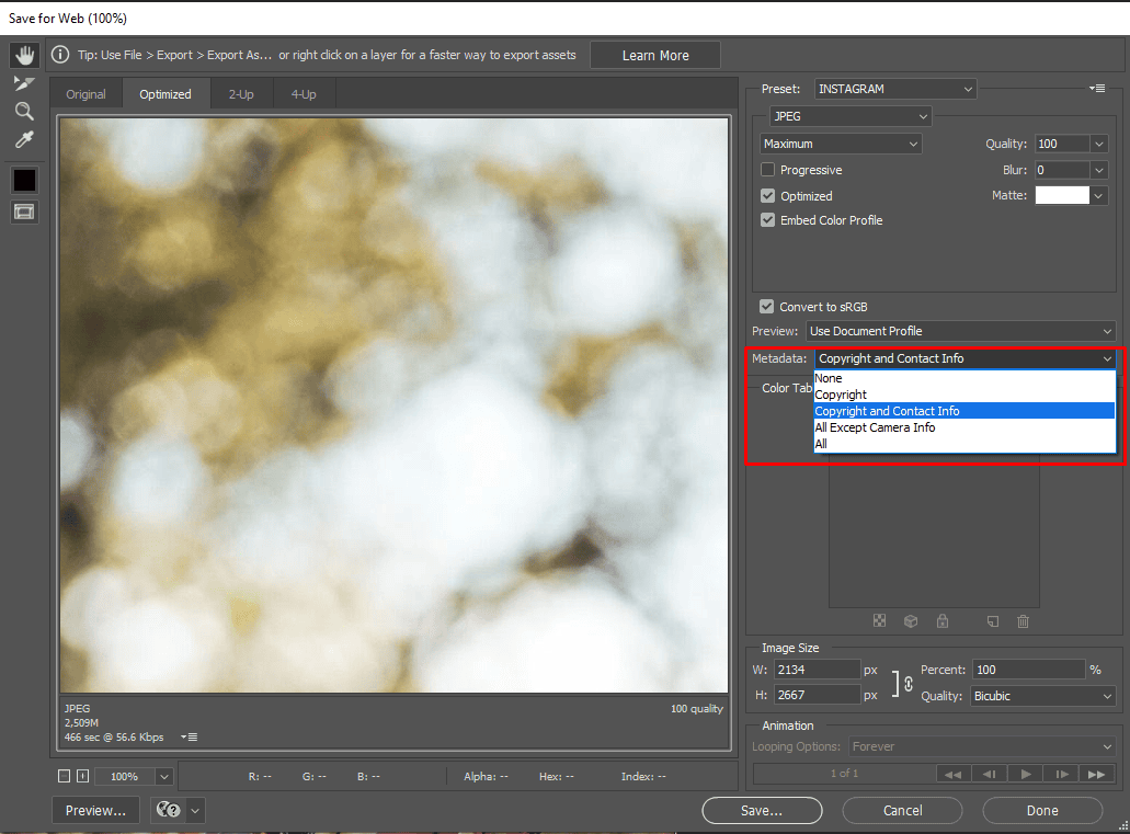 Desde nuestra ya amiga ventana de Guardar para web podemos elegir qué metadatos incrustar: