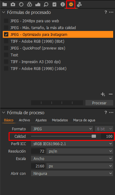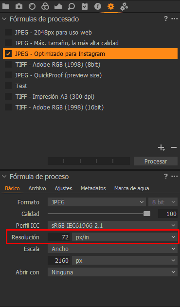 De nuevo, desde la pestaña de ajustes básicos de Fórmulas de procesado, seleccionaremos el ancho de 1080 o 2160px en función de lo que quieras