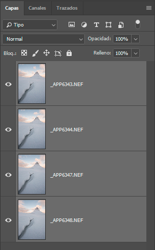 - Apilado de las fotografías: etapa inicial en la que apilaremos todas las fotografías en un solo documento de Photoshop. Para ello abriremos las imágenes e iremos montando una encima de la otra como capas independientes. Esta tarea se puede realizar de la manera que decidas: arrastrando, copiando y pegando… las posibilidades son infinitas.