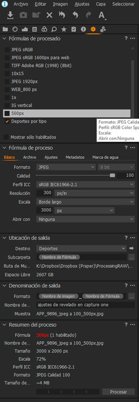 Ahora, si lo que queremos es sacar todo el provecho de las posibilidades de exportación que tenemos en Capture one vamos a tener que utilizar la herramienta de Fórmulas de procesado, una manera avanzada de poder exportar nuestras imágenes de una manera super rápida y ultra ordenada. No sabes todo el tiempo que estás perdiendo sin usarlas hasta que alguien te explica paso a paso como funcionan.