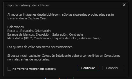 Aquí Capture One nos informa de qué se va a importar del catálogo de Lightroom Pulsando el checkbox de la esquina inferior izquierda podemos deshabilitar este aviso para futuras importaciones.