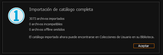 - Pulsamos aceptar y comienza el proceso de importación, que en función de la cantidad de fotografías que tengamos puede durar más o menos. En mi caso, este catálogo con 3000 fotografías ha tardado unos 3´en importarse.