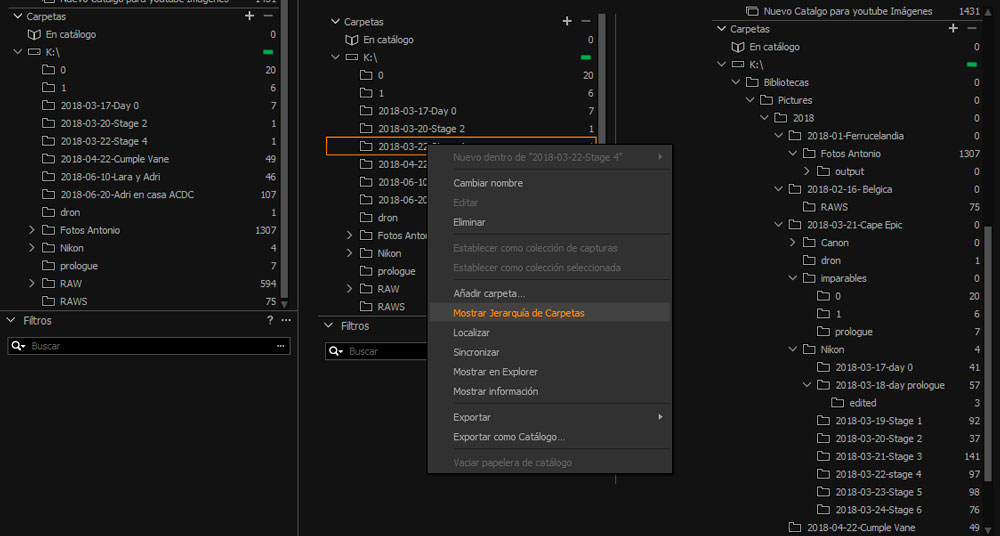 Del mismo modo si nos vamos a la sección de carpetas, veremos cómo aparecerán los discos duros desde los cuales se ha importado las fotografías, y las carpetas finales donde se encuentran los archivos. Esto para mí es un poco coña*o ya que no me parece intuitivo el nombre de la carpeta, algunas veces les llamo “Raw”, otras “final”, otras como sea…el caso es que no sé a qué directorio raíz pertenecen. Para resolver eso, lo mejor es pulsar botón derecho en cualquiera de las carpetas o discos duros que nos aparezcan y seleccionar “mostrar jerarquía de carpetas”.