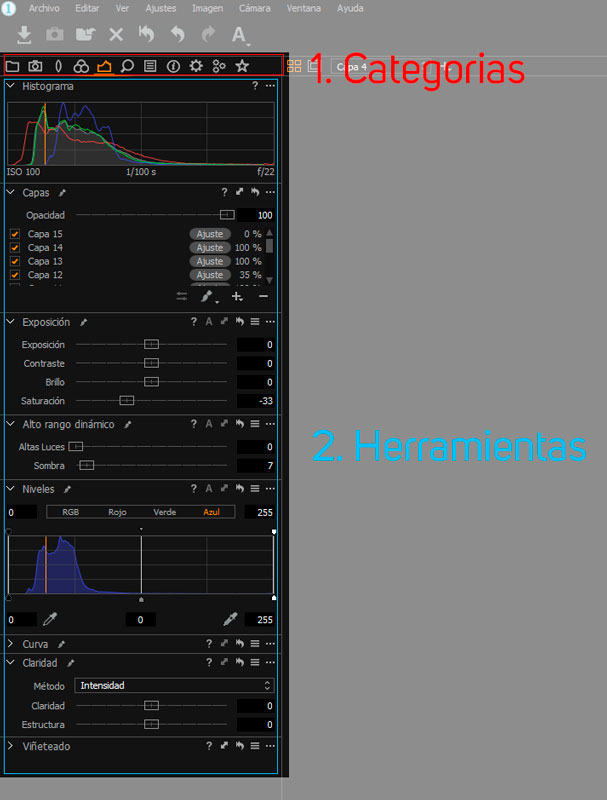 Es la zona en la que pasaremos más tiempo analizando sus componentes. Se encuentra dividida en diferentes categorías: biblioteca, Captura, exposición, color, tethering, etc… Y cada una de estas categorías está a su vez constituida por diferentes herramientas.