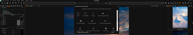 Son las barras superiores que están compuestas por botones que nos dan acceso directo a herramientas de uso frecuente, herramientas de cursor, interruptores on/off. En general son accesos directos herramientas que utilizamos con bastante frecuencia. Como todo en Capture One son supe personalizables, y aquí podremos poner las que más usemos nosotros. Para ello simplemente pulsa con el botón derecho en la barra superior, selecciona personalizar y arrastra el icono que desees, donde desees: