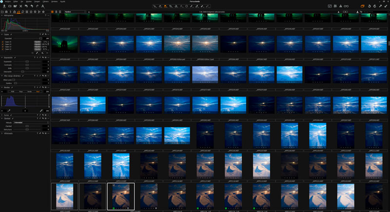 El navegador de Capture One va a mostrar las miniaturas de todas las fotos que aparecen en tu selección, carpeta, álbum, colección, catálogo, lo que sea. Podemos seleccionar todas las imágenes que queramos, y el visor se irá adaptando a las que hayamos seleccionado.
