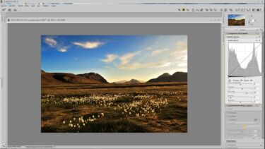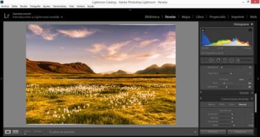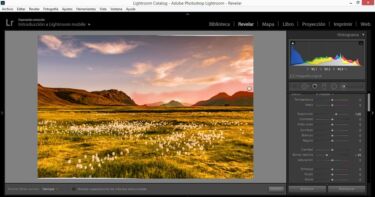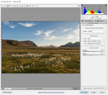 | Procesado en Lightroom, corrigiendo un poco el encuadre ya que me sobraba cielo e intentando darle fuerza a lo que para mi gusto son los puntos fuertes de la foto, que son las montañas de la izquierda y las flores de primer plano (además del cielo). |