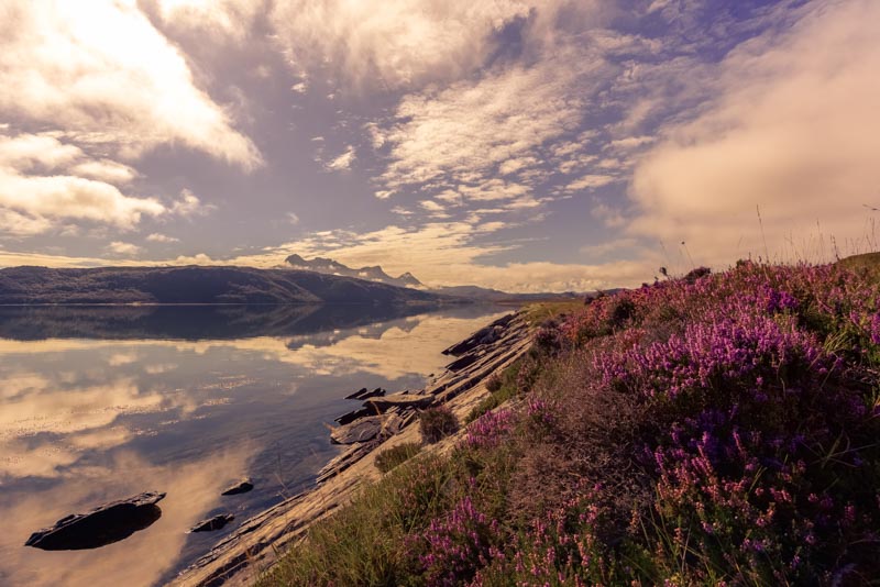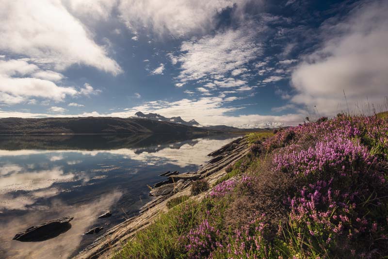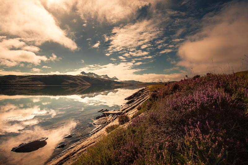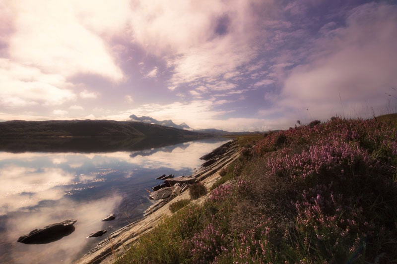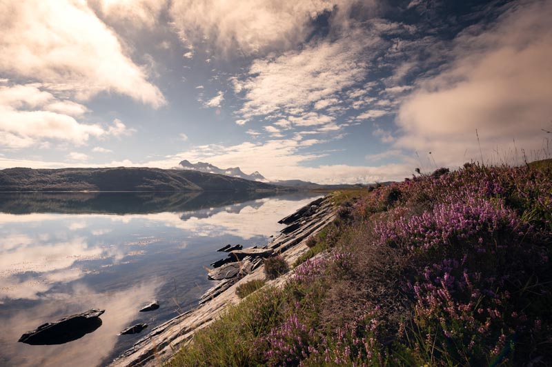 3. Algo de dodge and burn, mezclando el uso de máscaras de luminosidad más pinceladas a mi gusto. Poniendo más clarito sobre todo las flores de los brezos, los brillos de las piedras al contacto con el agua, un poco las laderas de esos montes del plano medio… Y oscureciendo el perfil de las montañas más alejadas de la imagen, para que contrastasen un poco más con las nubes.