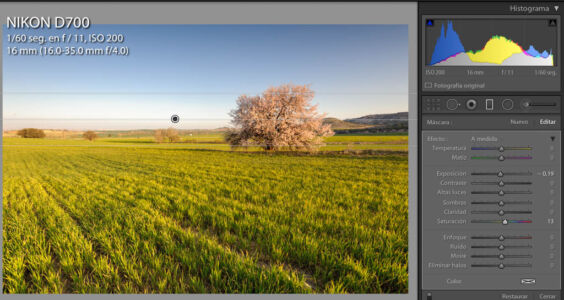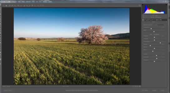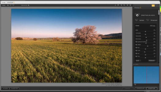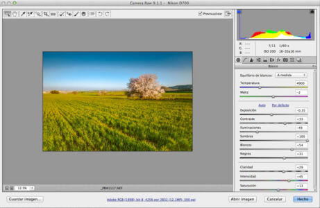 | En primer lugar como siempre pensar que le hace falta a la foto y viendo la luz que entra por la derecha he querido darle un toque más cálido del sol pegando más directamente sobre el almendro. En lightroom corrección de lente, equilibrio de blancos, |