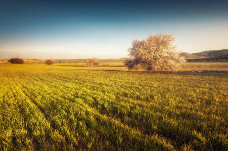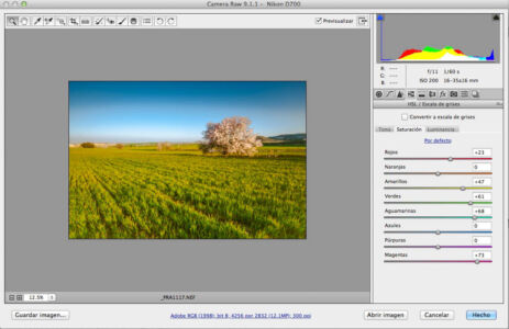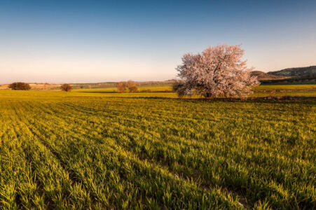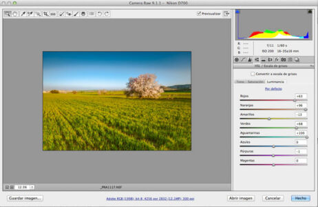 | Realizada en Camera raw. Se ajustó el balance de blancos muestreando en las flores del almendro. Clonar elementos indeseados, como camioneta, postes mota de polvo del sensor. Se añadió un cielo con nubes. Ajustar con el pincel de ajustes sobre la hierba para darle un tono mas amarillo. Dodge and burn en photoshop. Utilizar el ajuste de enfoque por zonas y poco mas. |