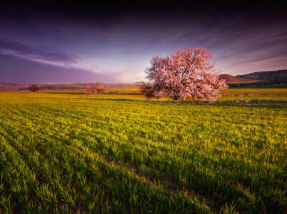 | Bueno es el primer archivo que proceso para Just Raw it, el revelado a sido integro con LR, ya que Photosho no lo domino mucho, he enderezado un poco la imagen, le he cambiado el matiz un poco hacia los tonos morados, para crear un tono de amanecer, al almendro le he metido un filtro radial para enfocarlo un poco y así destacarlo. |