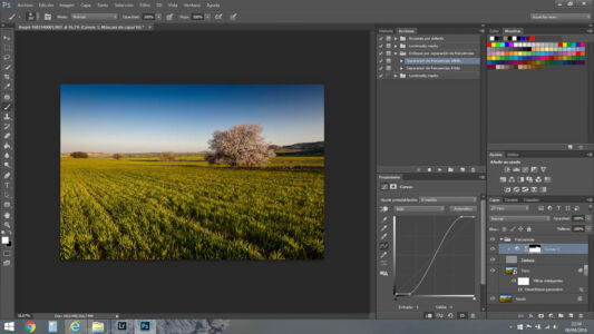 - Curvas en modo multiplicar para oscurecer la zona del cielo de manera gradual. Esto es lo que menos ganas tenía de currarme, y ha quedado un poco de «aquella manera»