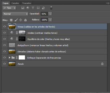 | He realizado un procesado básico en lightroom como se ve en las capturas con dos filtros radiales, uno que oscurece todo menos los arboles del fondo a la izquierda y otro que ilumina un poco el almendro principal. Luego en Photoshop he enfocado mediante separación de frecuencias, he clonado una furgoneta blanca y un par de postes (ya se que esto debería ser antes del enfoque pero se me ha pasado y se va a quedar así XD), luego mediante dodge/burn he remarcado un poco las líneas de la hierba y le he dado volumen al arbol, una capa de equilibrio de color para darle calidez a la hierba y a las luces muy altas, una capa de niveles con mascara de luminosidad tonos medios 3 para comprimir un poco los tonos medios y por ultimo un toque de viveza en el fondo a la izquierda para meterle un pelín mas de calidez. Saludos. |