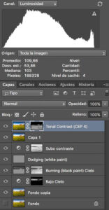 | Hola amigos, Lo que pretendo mayormente en la versión de este raw es darle más vida, mas luz y textura a la parte principal dela imagen. Luego también he querido equilibrarla aportando texturas al cielo. Mis pasos: 1. Ajustes desde camera raw 2. Pincel corrector en vehiculos, postes… 3. Mascara de selección para cielo y aplico filtro frio 82 al 32%. Apoyo pintando con azul sobre la selección en la capa fondo copia. 4. Ejecuto la acción de máscaras de luminosidad. Pinto en Dodge & Burne con blanco seleccionando luces 2 (para aclarar mas y con contraste), e idem pero con pincel negro en sobras 2 (para oscurecer con contraste) 5. Abro la acción de claridad dinámica y seleccionando el canal luces dos lo aplico a claridad textual. 6. Ejecuto la acción de separación de frecuencias para enfocar almendro y parte del sembrado que contiene mas luz. 7. Y por ultimo retoco el cielo simulando nubes aplicando degradados y filtro “nubes” dándole perspectiva y desenfoque de movimiento. |