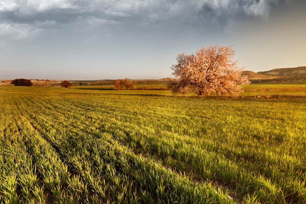 | Realizada en Camera raw. Se ajustó el balance de blancos muestreando en las flores del almendro. Clonar elementos indeseados, como camioneta, postes mota de polvo del sensor. Se añadió un cielo con nubes. Ajustar con el pincel de ajustes sobre la hierba para darle un tono mas amarillo. Dodge and burn en photoshop. Utilizar el ajuste de enfoque por zonas y poco mas. |