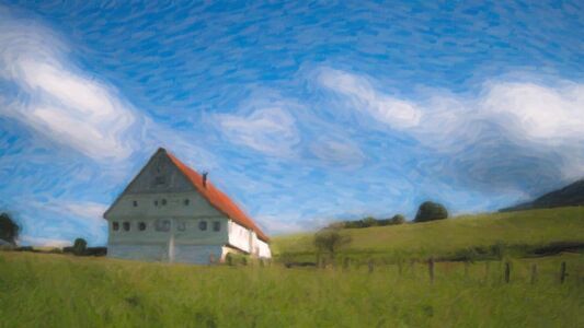 | No era fácil esta semana, o al menos a mi me lo ha parecido. Un paisaje perfectamente expuesto, con colores de origen muy correctos y que solo necesitaba una corrección de perspectiva y arreglar un poco la casa que andaba algo deformada, fruto del gran angular. Después de un ajuste básico en LR, la pasé a Photoshop donde hice las correcciones antes mencionadas, un enfoque por separación de frecuencias afectando al contraste y ya está. No se me ocurría hacer nada para mejorarla, ya estaba bien así. Aunque, la verdad, es siendo correcta, la imagen no me decía gran cosa… sólo tranquilidad, sosiego, calma, etc. Así que lo dejé reposar. El fin de semana fui a ver la exposición de Caravaggio en el Thyssen y luego me di una vuelta por la colección permanente. Viendo los impresionistas, se me vino a la cabeza la imagen de la casa. ¿Y si hiciera algo así con la imagen de la casa? (salvando las distancias, claro) Así que, cuando llegué a casa me puse a ello. A base de claridad a tope negativa, filtros de desenfoque de movimiento en las nubes y para terminar el filtro Skin art, configurando los pinceles, me salió este resultado que les presento. Espero que sea de vuestro agrado. Saludos. |