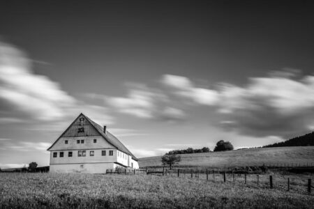 | Esta semana me decidí por un Blanco y Negro. Correción de lente vertical para enderezar la casa y recorte para darle mas protagonismo a la casa. Contrastar luces y sombras, varios filtros para acentuar el cielo, agregar viñeteo y para darle algo de claridad a las nubes y al cesped del primer plano. Pincel de ajuste para aumentar la exposición del frente de la casa. Burn and Dodge por medio de filtros radiales. Clonado de los cables y de la cañería del frente que noe me gustaba nada. Algo de enfoque y listo. |