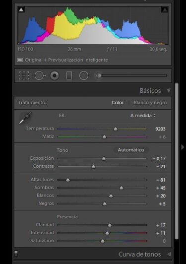 | Hace poco que conozco la pagina y como ves estoy tan encantada con ella que me he decidido a probar de editar la foto. He usado LR5 (aqui la neblina ni se asoma 😉 ) Lo primero ha sido corrección de lente para endezar un poco la foto. Vertical -14 He subido la temp un poco (7950) y el matiz hasta más de 30. He bajado las altas luces (-27) y he subido sombras (+54), blancos (+15) y negros (+23). Claridad a 50, intensidad a 23. En la curva: claros +10, oscuros -23 He aumentado la saturación del naranja hasta +20, la del azul a +15 y la del purpura a +33. En luminosidad: naranja -8, amarillo +14 y azul -25. He dividido tonos (no lo había usado nunca este panel ), en sombras he subido el tono a 30 con una saturación de 6. Un poco de viñeta con filtro graduado y algún toque de luz y de sombra con filtro radial |