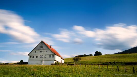 | una semana mas por aquí. Análisis de la foto:Corrección de perspectiva, enderezar la casa. Creo que en cuanto al encuadre le viene bien un pequeño recorte por la izquierda para anular el arbusto que sale cortado y por arriba también le sobra un poco de cielo azul que no aporta mucho a la foto. Los colores están muy apagados y necesita un poco de nitidez. Al toro… comienzo enderezando la toma y recorto por la izquierda y por arriba. Revelado básico en lightroon, un poco de calidez, claridad y contraste en la curva de tonos. Como muestran las sombras del alero de la casa y la chimenea, el sol incide desde la parte superior derecha de la foto, lo que me lleva a aplicar un filtro graduado aportando luminosidad y calidez a esa zona iluminada por el sol. A la parte del campo del primer plano y derecha le aplico un Dodge and Burn para resaltar las zonas de luz sombras . Por último en PS aplico un enfoque por separación de frecuencias, (Acción que nos regalaste) y listo. No se si lo habré conseguido pero por lo menos lo he intentado y practica a practica se coge experiencia ja ja. un saludo |