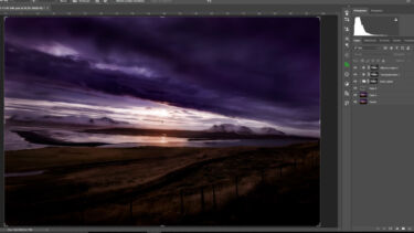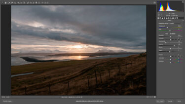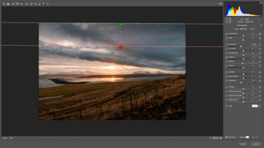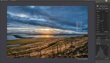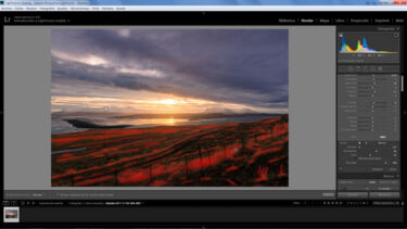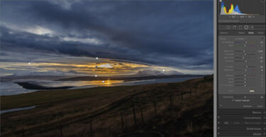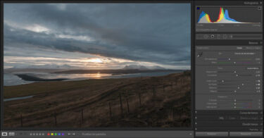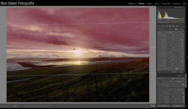 | Unicamente he utilizado Lightroom, realizando ajustes de tono y luz, después dividir tonos, corrección de lente y calibración de cámara con «landscapeV4». Después he utilizado tres filtros graduado para el cielo, otro para la pradera y otro en la parte derecha. «Dodge & burn» para varios puntos de luces y sombras en pradera y algunos en las montañas, uno principal para la luz central del sol, con filtros radiales y para terminar, he utilizado pincel de ajuste, para remarcar ciertas sombras y luces para algunos detalles. |