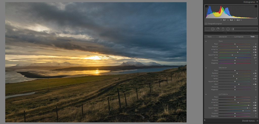 Hola Ángel, pues para mi gusto dos partes, por una parte un primer plano “decente” con demasiado contraste y poca nitidez para mi gusto, pero pasable. Y una zona del sol que hay que revisar si o si. Se nota mucho el “brochazo” de color, no hay transición lateral, no tiene sentido un color tan intenso ahí, y ausencia total de color en las nubes colindantes, tiene que ir todo más equilibrado. El problema? Que en Lightroom no es fácil conseguir esa sutileza, en Photoshop, usando máscaras de luminosidad y estos consejos es muuuy sencillo. En lightroom hay que ser muuucho más sutil si no queremos pasarnos. De todas maneras mil millones de gracias Angel!!!
