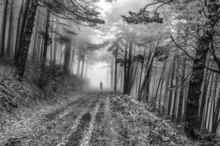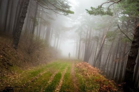 ahí va mi versión… primero he recortado para enderezar la figura y luego he metido filtros, uno cálido desde abajo a la izquierda en diagonal, otros tres redondos (elípticos) fríos, uno por arriba, otro en el centro en la figura y otro en diagonal para de ese modo enfriar el ambiente neblinoso y aumentar el contraste árboles-fondo, el resultado es una zona cálida en primer plano con hierba y helechos más vistosos y un fondo azulado frío que buscan dar la sensación de que la figura se adentra en un mundo desconocido abandonando el calor de lo conocido…Mikel Ibañez de Aldecoa
