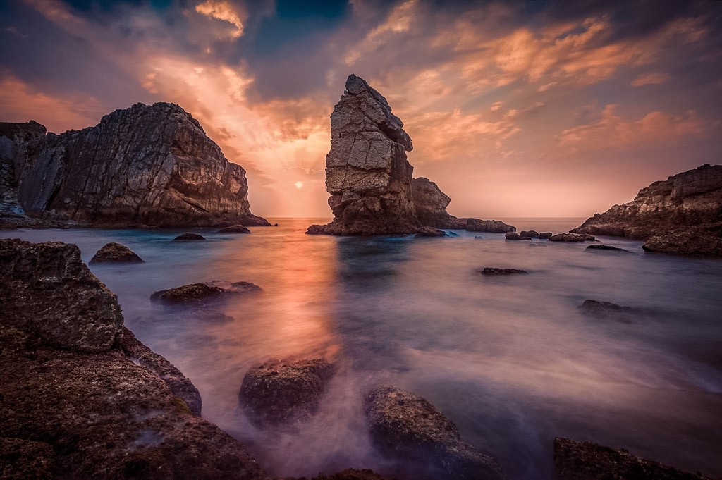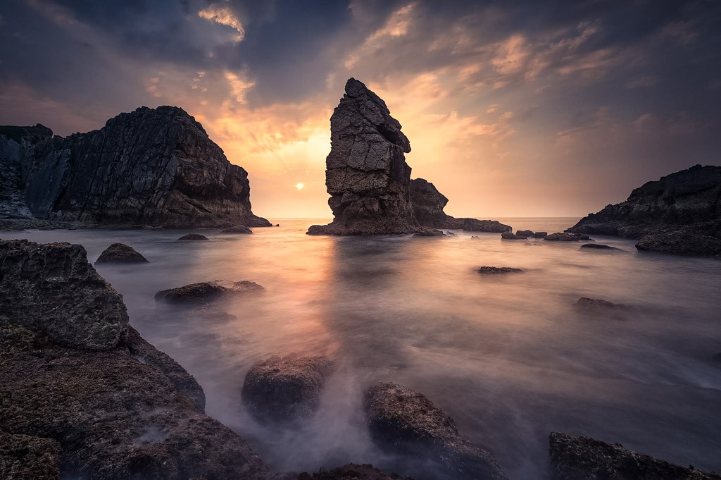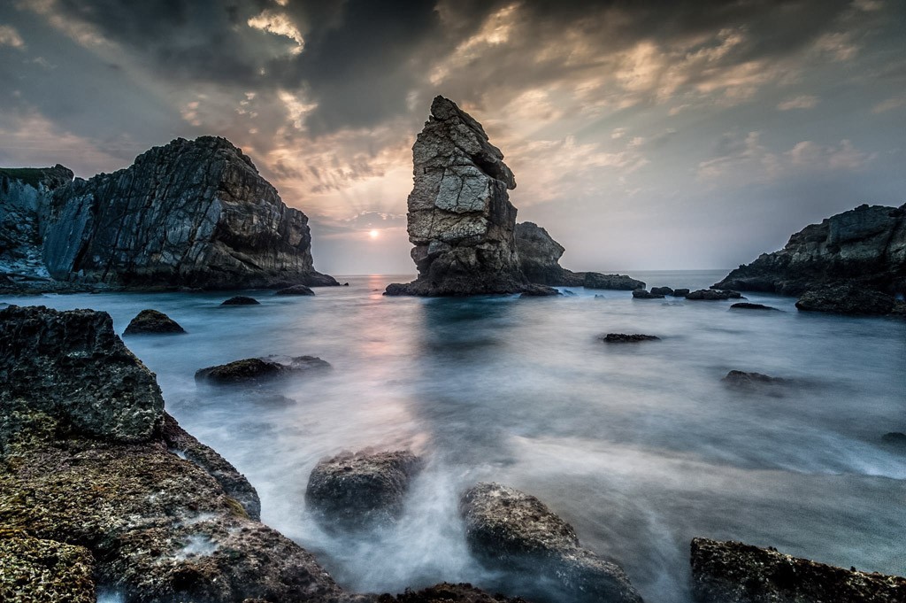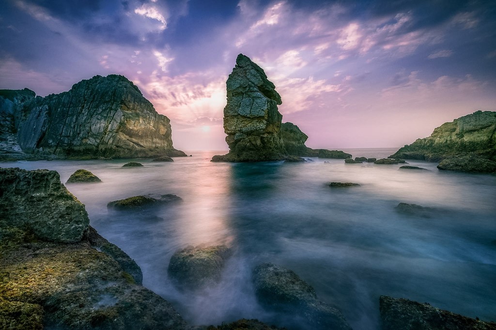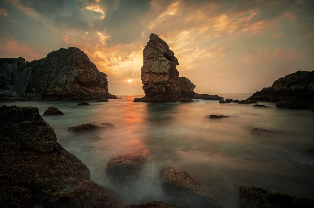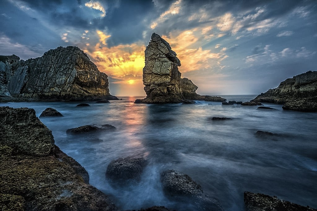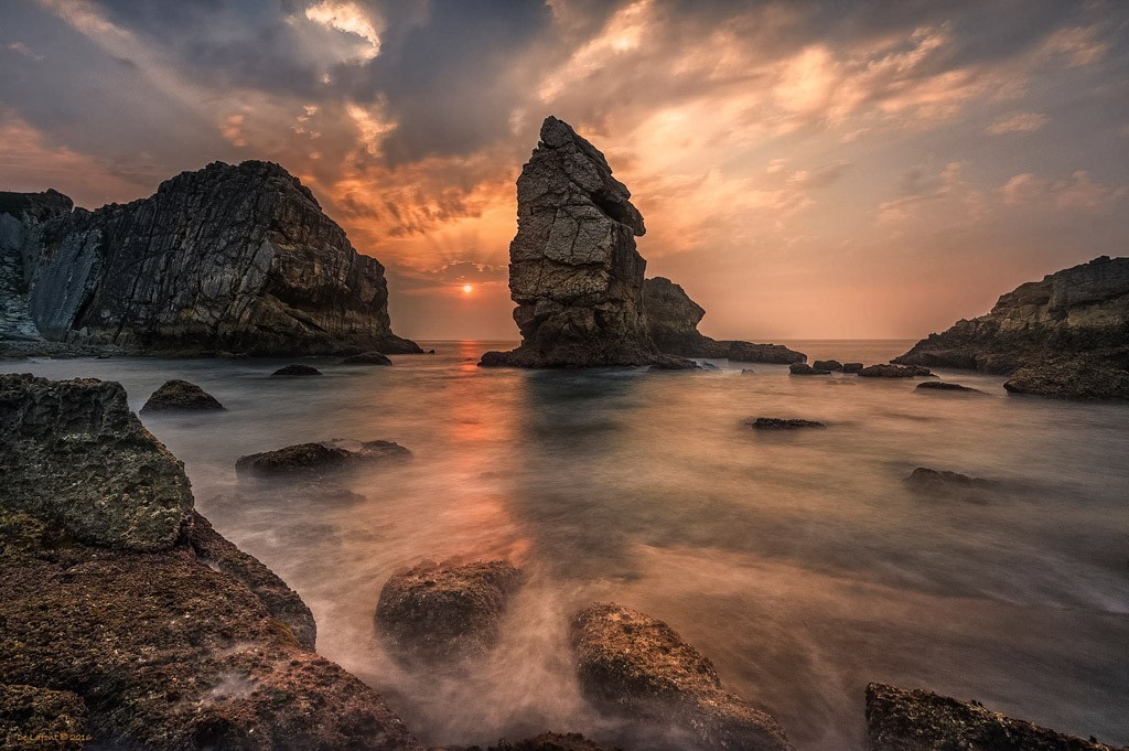 Esta semana ya os indiqué que la fotografía elegida era la que tomé en la Playa de La Arnia, un lugar espectacular para la fotografía pero que, como todos los que han ido alli armado de su arsenal fotográfico podrán corroborar, es tremendamente dificil de componer. La fotografía en sí es una típica imagen marina tomada al atardecer, cuando la marea estaba baja, pero ya subiendo. La idea inicial era realizar una muy larga exposición, (que también tengo) pero enseguida comprobé como lo que mejor funcionaba era una exposición de 1 segundo aproximadamente, ya que se podría mantener parte del dinamismo que aportaban las olas rompiendo en las rocas.