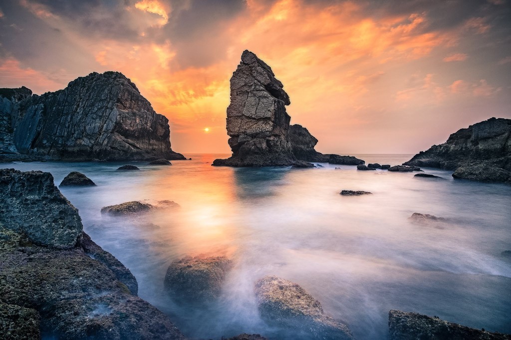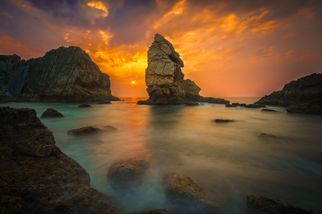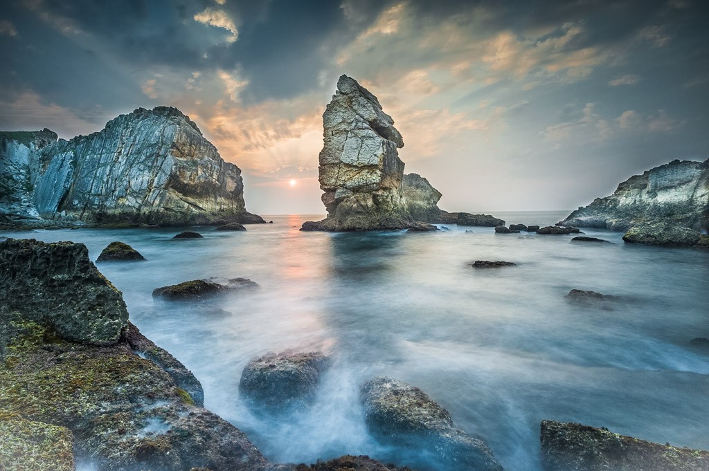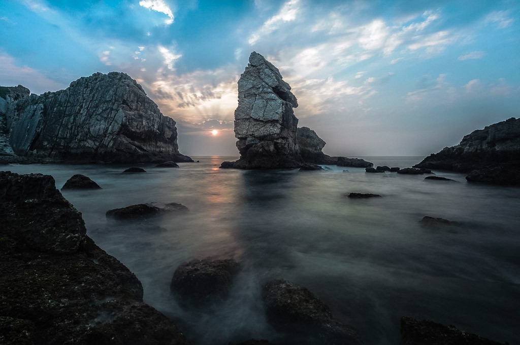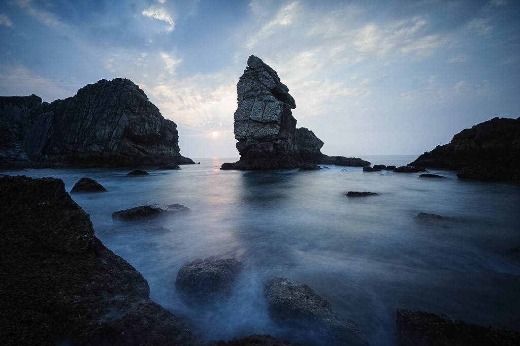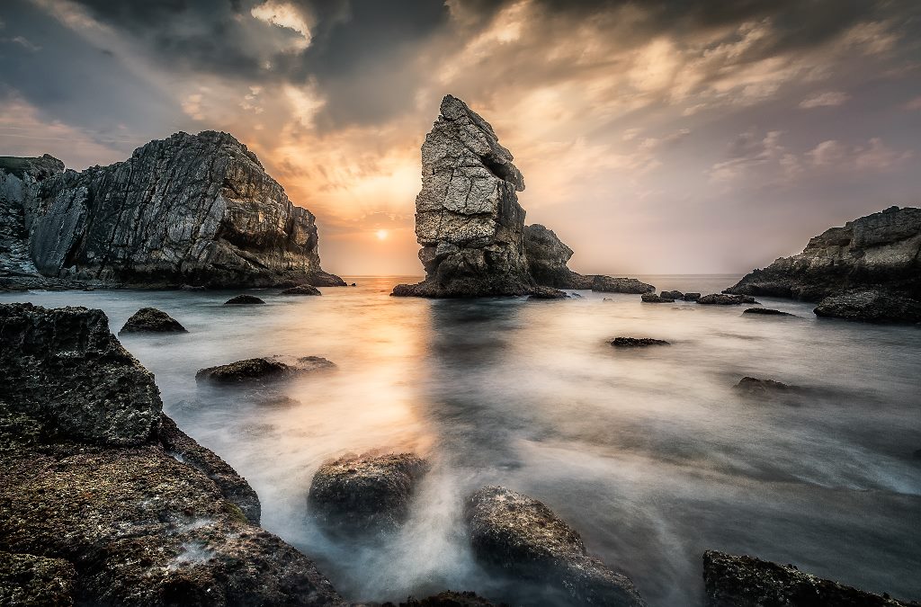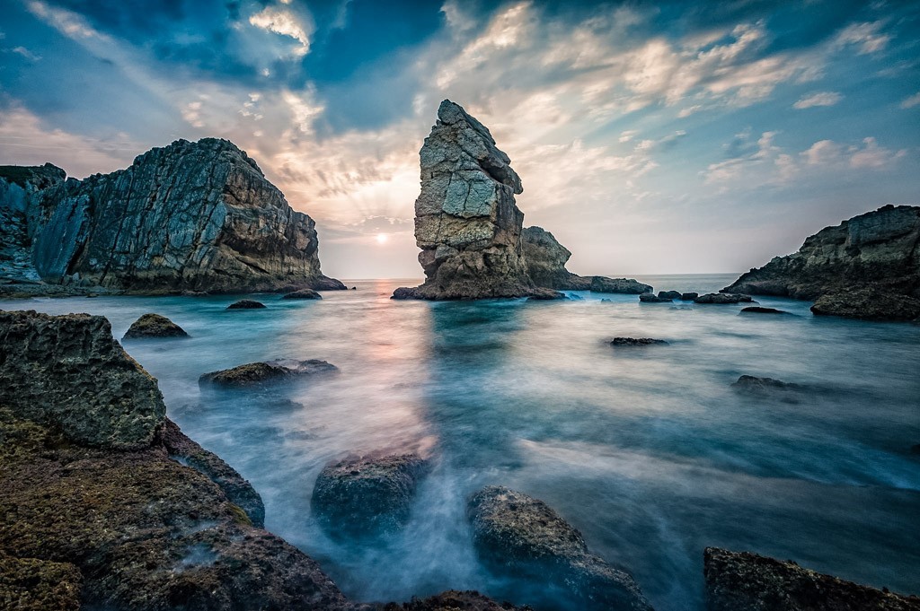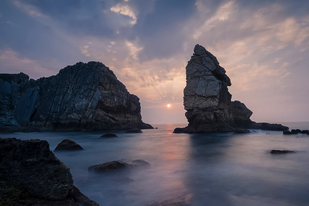 Esta semana ya os indiqué que la fotografía elegida era la que tomé en la Playa de La Arnia, un lugar espectacular para la fotografía pero que, como todos los que han ido alli armado de su arsenal fotográfico podrán corroborar, es tremendamente dificil de componer. La fotografía en sí es una típica imagen marina tomada al atardecer, cuando la marea estaba baja, pero ya subiendo. La idea inicial era realizar una muy larga exposición, (que también tengo) pero enseguida comprobé como lo que mejor funcionaba era una exposición de 1 segundo aproximadamente, ya que se podría mantener parte del dinamismo que aportaban las olas rompiendo en las rocas.
